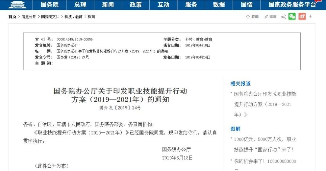 5月24日,國務院印發(fā)《職業(yè)技能提升行動方案(2019—2021年)》。