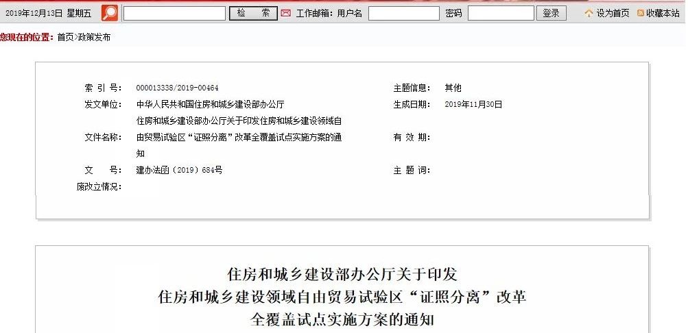 11月30日,住房和城鄉(xiāng)建設部印發(fā)住房和城鄉(xiāng)建設領域自由貿易試驗區(qū)“證照分離”改革全覆蓋試點實施方案的通知。